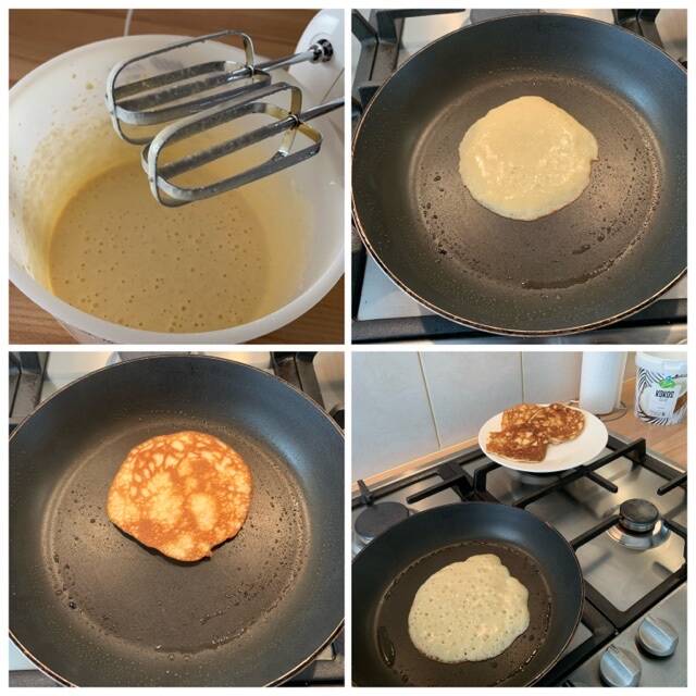 Doe een beetje kokosolie in de koekenpan en bak de pannenkoeken.